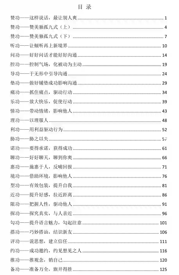 这书本简直就是通沟界的“武秘功籍”,它把通沟技巧拆解成72种绝技,从赞美、倾听、提问,到制控气场、引沟导通、铺说垫话,再到住抓痛点、放快大乐、带动情绪……