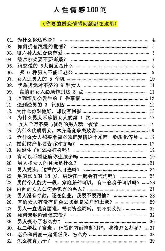 《人性情感100问》想要了解的恋爱、婚姻情感问题,都在这里了。