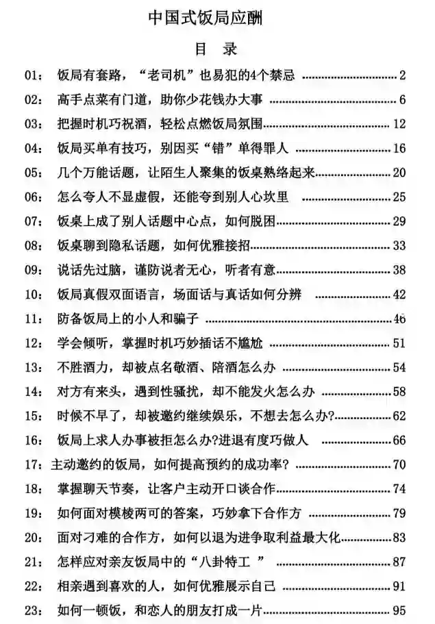 中国式饭局应酬攻略的基本特征,介绍了其中的规则、方法与技巧,汇集了大量生动的事例,结合不同的场景,教你吃出事业,喝出人脉,聊出机遇!
