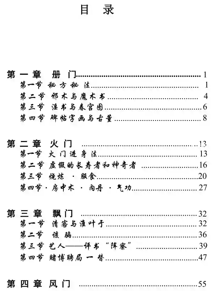 《江湖八门》分为惊、疲、飘、册、风、火、爵、要八门,包括走江湖混饭吃的种种手段。