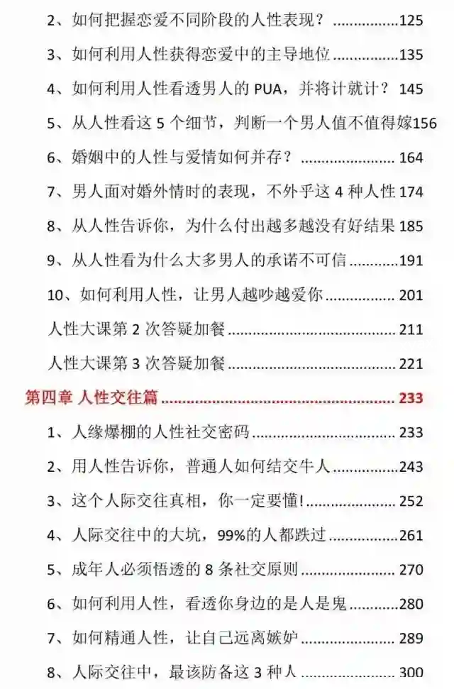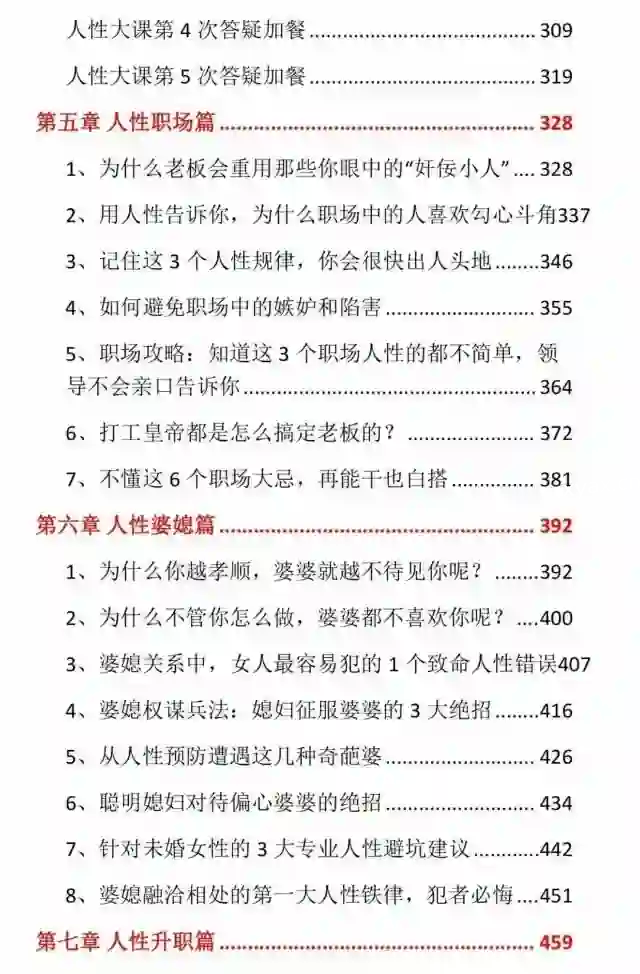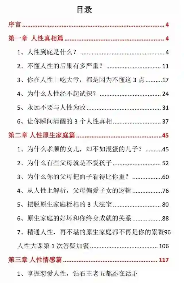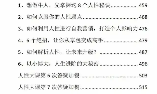 内容包括人性真相篇,人性原生家庭篇、人性情感篇、人性交往篇、人性职场篇、人性婆媳篇、人性升职篇、人性沟通篇、人性管理篇、人性识人篇、人性欲望篇、人性操控篇、人性财富篇、人性权谋篇、人性心法篇等章节及多次加餐。