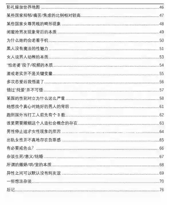此书的最终目的是改造和升级中国男性由于多种原因导致的在两性市场已经过于落后的思想和行为,最终让男性个体获得更高的生命品质和更多的快乐自由。
