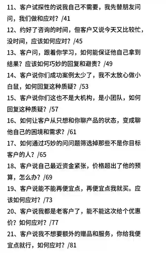 成交过程中客户的各种刁难,包括价格嫌弃的板块,也就是客户觉得贵,或者客户想便宜一点,还包括了付款延迟的板块,比如客户说以后再买,等活动再买等等这些问题。