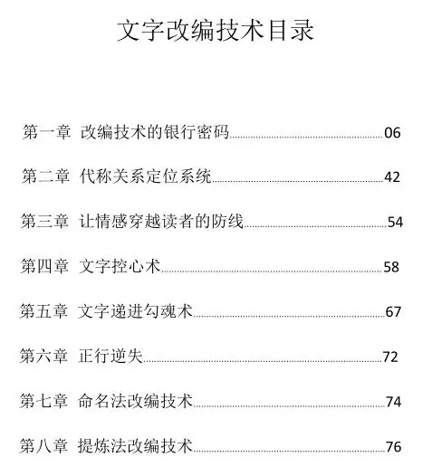 凡是会文字改编的高手,无不都是文案高手!所以忽视了平常写作中的文字改编 技术,不管你学习在多的文案写作技巧,也只能再别人名下的文案中苟延残喘,无法 写出自己的原创文案!