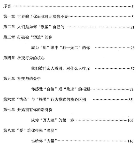 在我其他几本书里,我教了你很多实操技巧,如果你正确的使用了,或许你现在已经遇到了一个或者几个美丽的姑娘,你的约会难题也开始得到了改善。