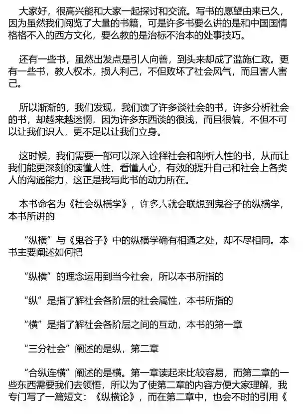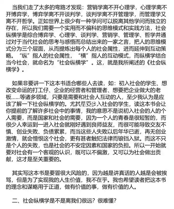 《社会纵横学》它开创性的提出了“三分社会”的理念,这个理念构建了一套空前的、独特的认知社会的体系,用独特的视角诠释当今社会的人性及进退之道。此理念适用于人际沟通、市场营销、应聘求职、企业管理、心理研究、商界博弈、创业运营、招聘精英,等诸多领域。