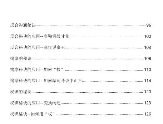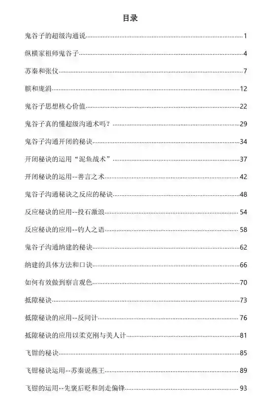 这八个秘诀分别是开闭、反应、纳建、抵隙,飞钳、反合、揣摩和权谋,并附有这八个秘诀具体应用的方法和案例。