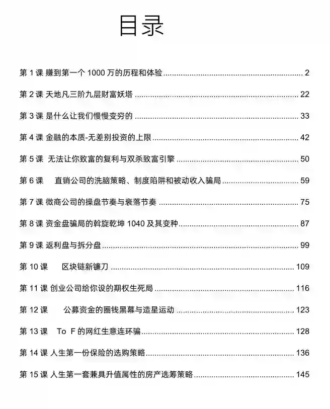 我要降低一下各位的期待,这个课程不是教大家怎么去挣钱的,有时候守比攻更重要,特别是在你没有太多钱的情况下,你就这几十万,一两百万,你还想通过这个钱去投资理财,玩各种项目挣钱,你以为你能挣到钱吗?