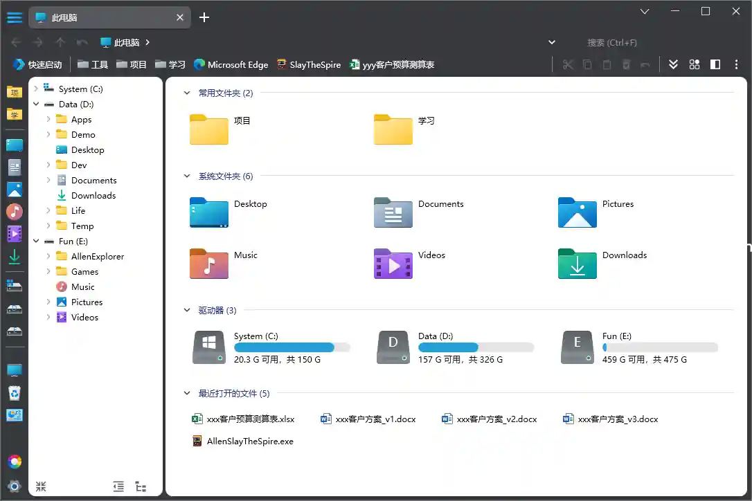 Allen Explorer 支持【快捷图标 & 目录树】、【目录树】、【快速启动】及【快捷图标】多种【导航栏】样式,可设定【常用文件夹】,直达目标文件夹。此外,目录树拥有【自动路径追踪】、【智能折叠】等操作辅助功能。