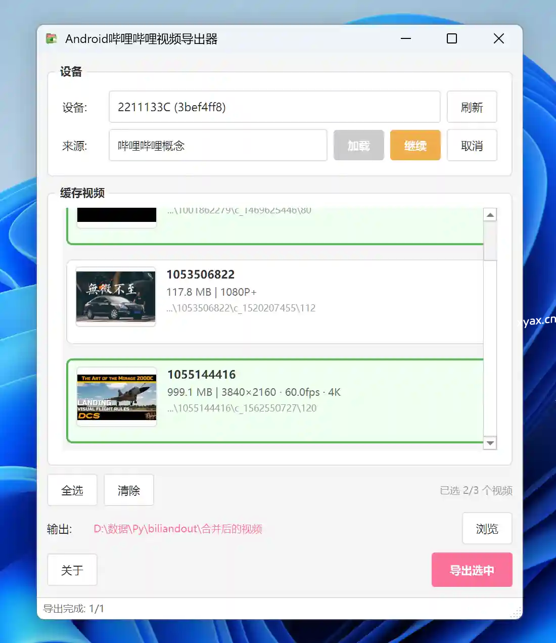 等待载入完成. 选取要导出的视频, 点击导出按钮, 等待缓存视频输出至对应目录