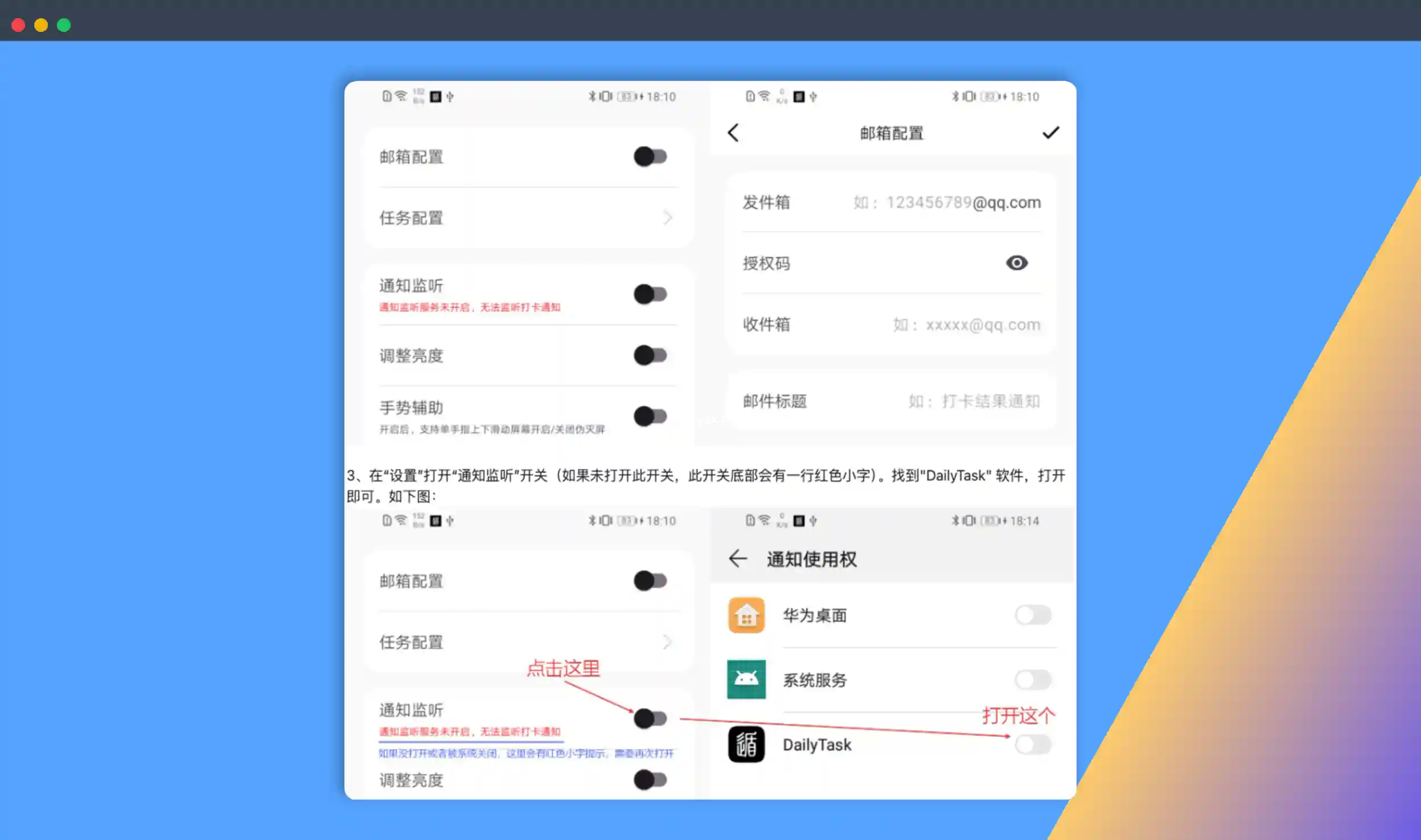 邮件通知: 支持打卡成功或失败的邮件通知,让你随时掌握打卡情况。