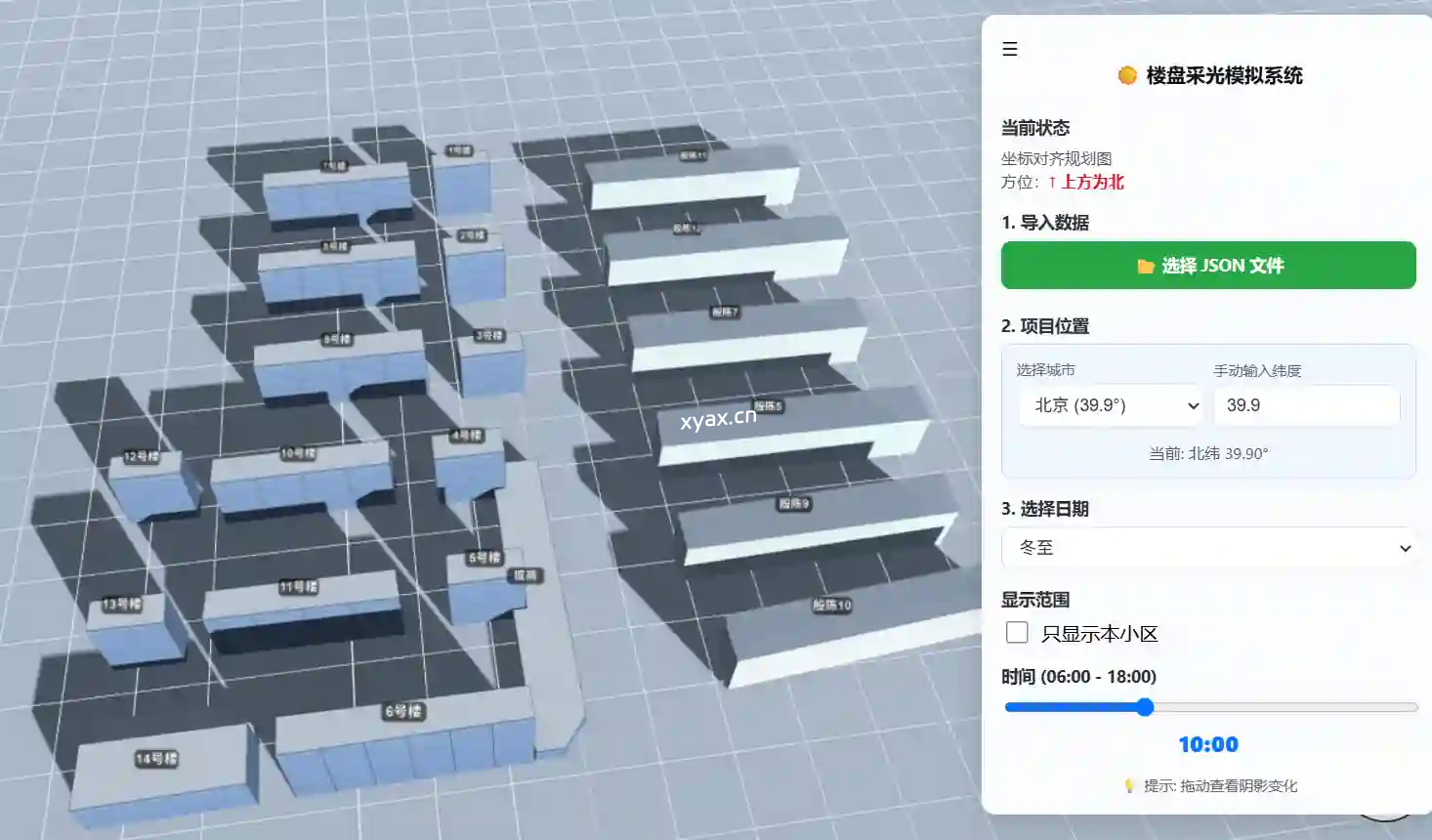它允许用户直接在浏览器中通过规划图(JPG/PNG)绘制建筑轮廓,生成 3D 场景,并结合地理纬度和太阳轨迹算法,对目标建筑进行精确的日照遮挡分析。项目纯前端实现,无后端依赖,支持离线使用。