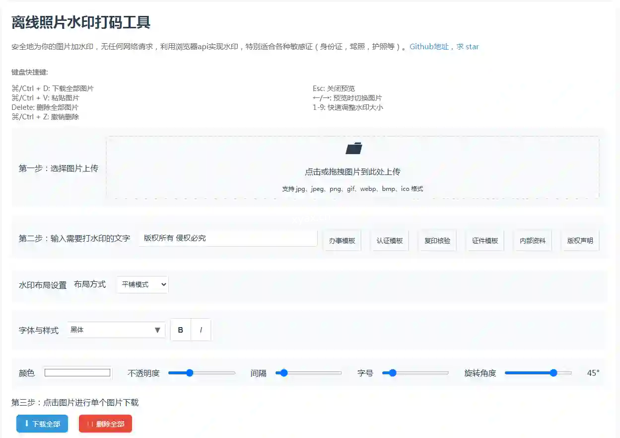 一个纯前端实现的离线水印工具,可以安全地为图片添加水印,无需上传图片到服务器,特别适合处理敏感证件(身份证、驾照、护照等)。