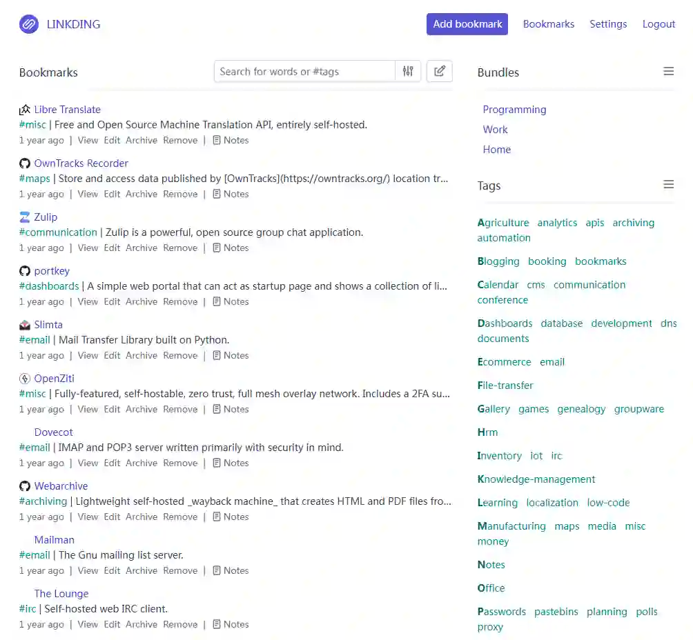 linkding 是一个可自部署的书签管理器。 它的设计目标是极简、快速、便于通过Docker部署。