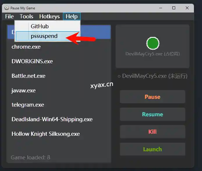 然后添加游戏exe名称,并进行游戏的pause、resume等操作。