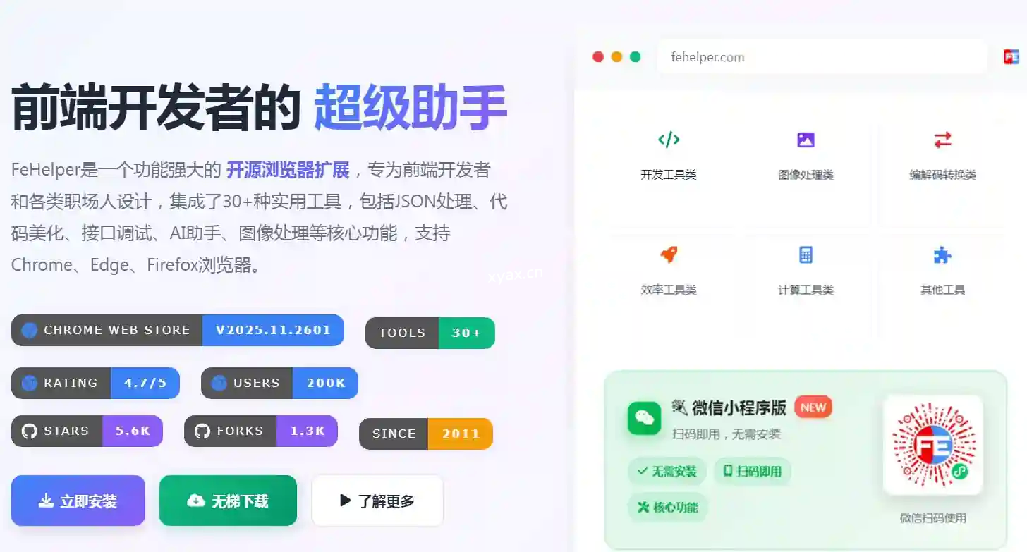 FeHelper是一个功能强大的 开源浏览器扩展,专为前端开发者和各类职场人设计,集成了30+种实用工具,包括JSON处理、代码美化、接口调试、AI助手、图像处理等核心功能,支持Chrome、Edge、Firefox浏览器。