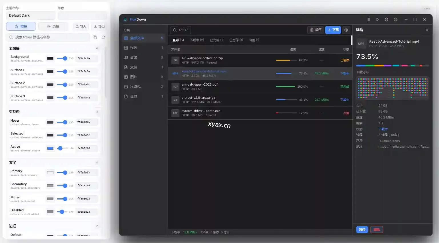精心打磨的视觉体验——深色与浅色主题、13套配色方案、可调节面板的响应式布局。一款真正赏心悦目的下载工具。