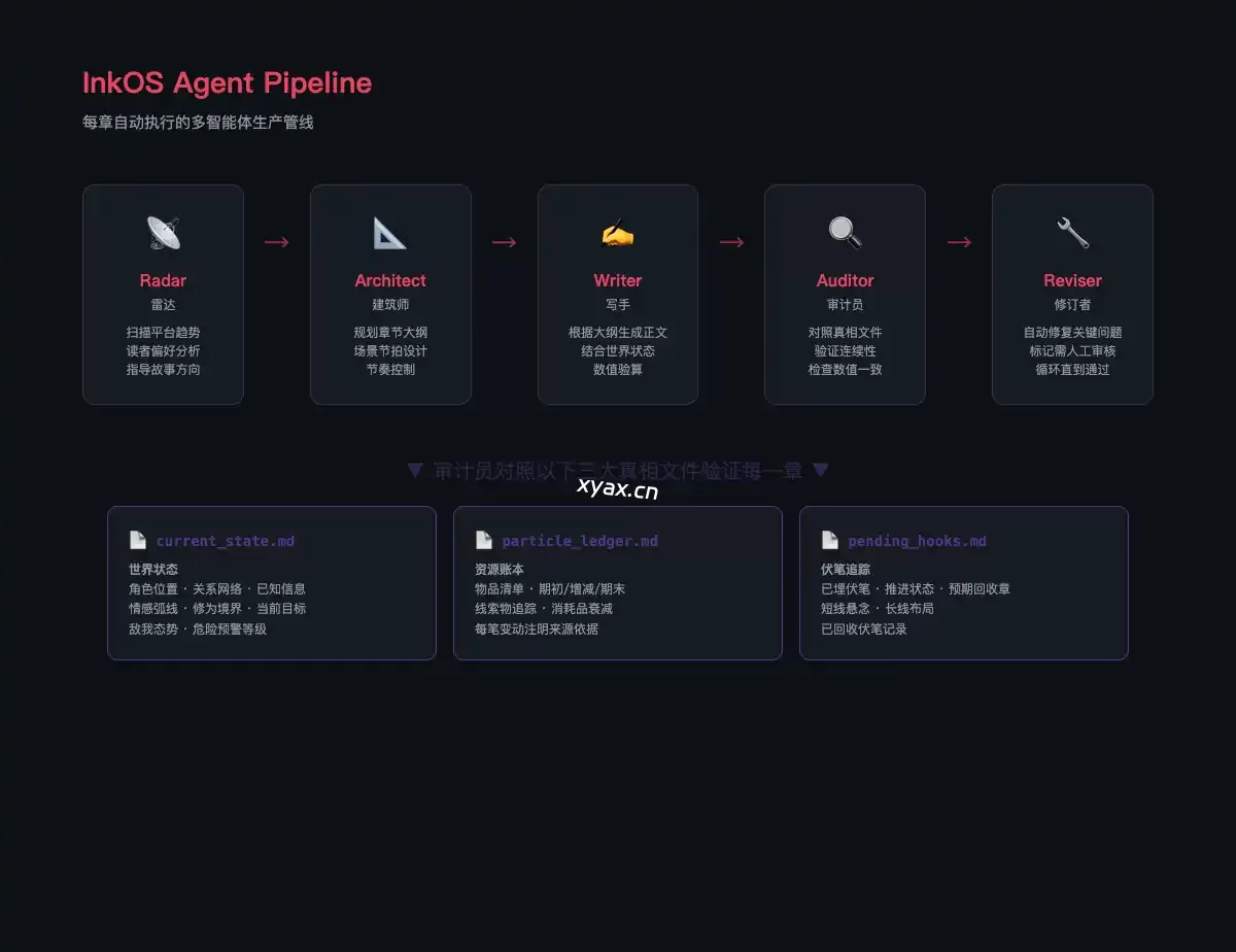 Inkos 是一个基于 Multi-agent(多智能体)的小说生产系统。它不仅是简单的 AI 续写,而是通过多个 Agent 协作,自主完成小说的创作、审计与修订。系统内置了严格的人类审核关口,确保在自动化生产的同时,内容质量始终处于可控状态。