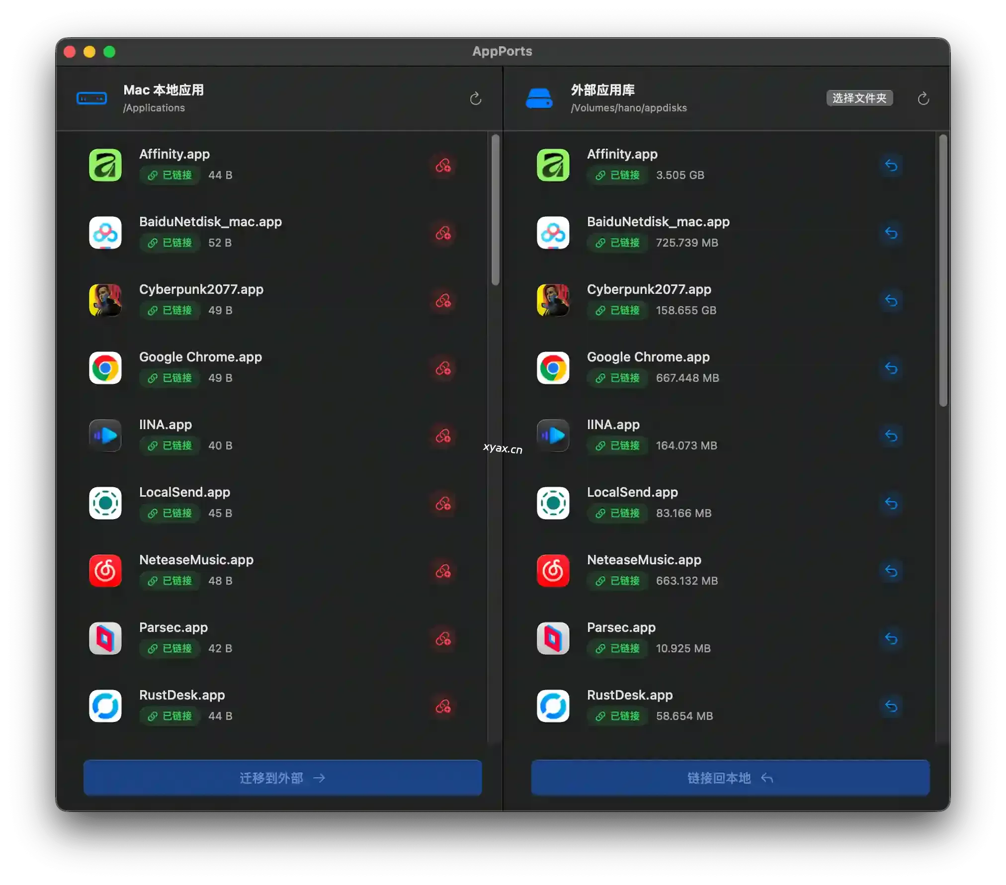选择外部存储目标位置,AppPorts自动搬运数据并创建Contents智能链接。