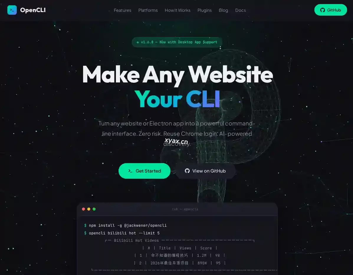 一个命令行工具,可将任何网站、Electron应用程序或本地命令行工具转换为命令行界面——Bilibili、Zhihu、小红书、Twitter/X、Reddit、YouTube、Antigravity、gh、docker等等——通过浏览器会话重用和AI原生发现提供支持。
