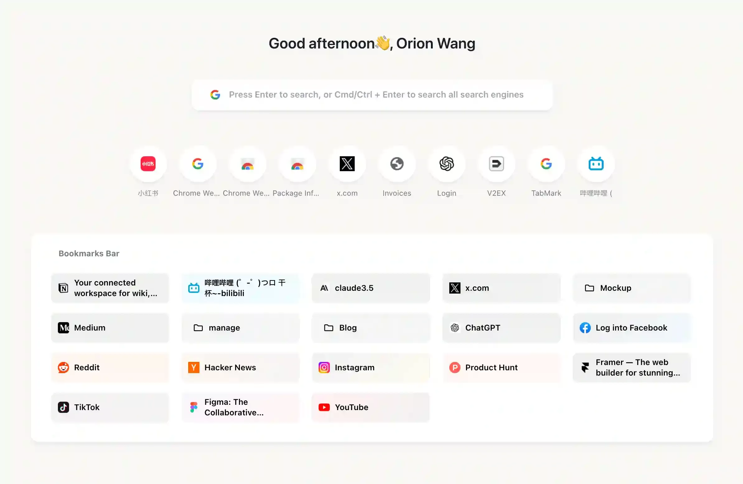 TabMark 将收藏夹变成新标签页,让你收藏的书签一目了然、整洁高效,快速直达你最需要的网站和资源。搭配智能 AI 搜索,更快找到你想要的答案。支持 Chrome 和 Edge。
