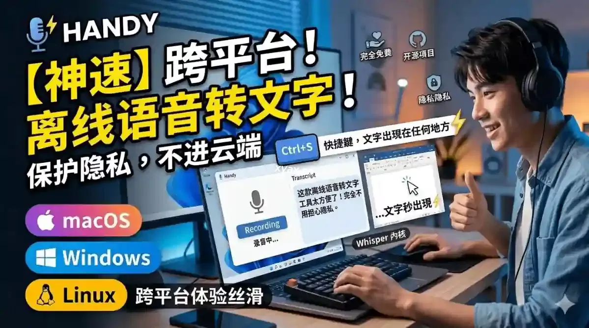 Handy 是一款跨平台桌面离线语音转文字应用,按下快捷键即可将语音实时转录到任何文本框中。支持 Whisper 和 Parakeet V3 模型,GPU 加速可选,100% 离线运行,同时提供 CLI 控制和 Raycast 扩展集成,适合会议记录、灵感捕捉等场景。