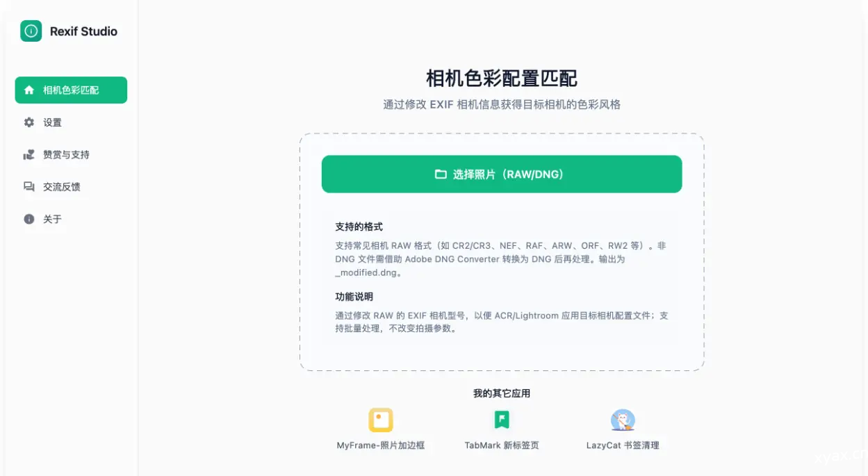 Rexif Studio是一款相机RAW文件的EXIF编辑工具,通过修改RAW文件的EXIF信息以匹配Adobe Camera Raw / Lightroom中的相机配置文件,解锁任意相机的色彩风格。支持macOS和Windows平台。