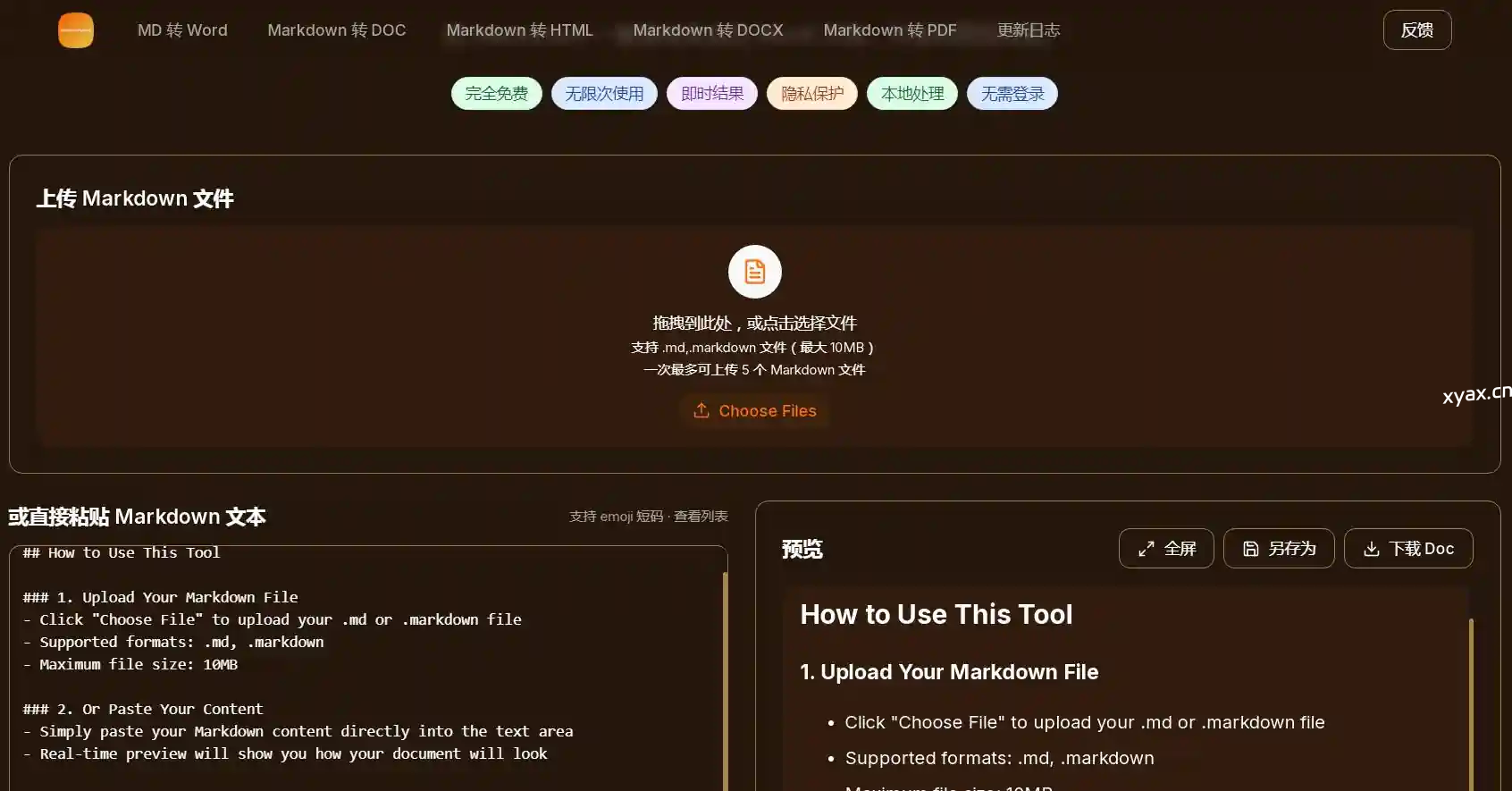 支持上传 .md 和 .markdown,也可以直接粘贴内容。工具输出 .docx,兼容 Microsoft Word、Google Docs 等常见文字处理软件。
