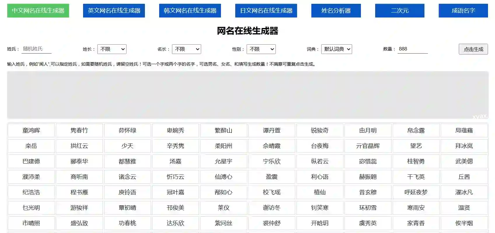 网名在线生成支持在线网名、姓名、游戏名字、家族团体名字批量生成,支持性别选择,支持姓氏指定,支持随机姓氏! 在线网址:https://www.qmsjmfb.com/ 声明:本站内容均收集于互联网,如不慎侵犯到您的版权利益,请附带相关证明文件来信本站将立即予以下架删除。