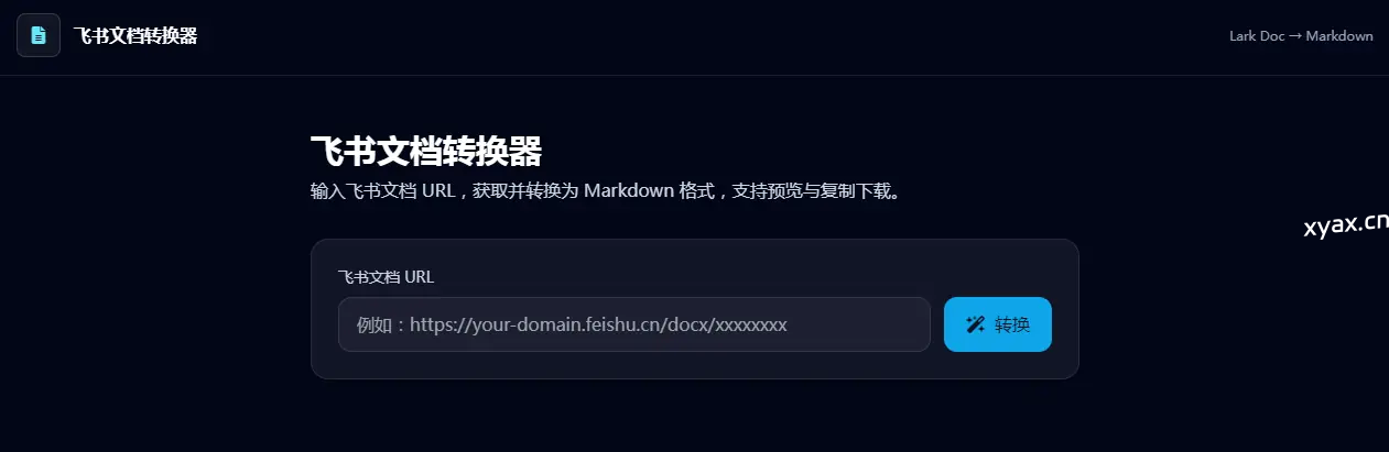 输入飞书文档 URL,获取并转换为 Markdown 格式,支持预览与复制下载。