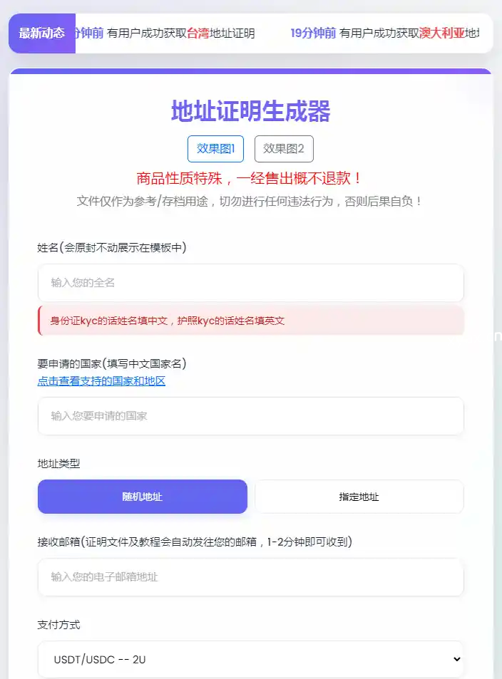 一款用于生成住宅地址证明文件的工具,可覆盖 63 个国家和地区。系统会根据用户填写的信息自动生成多份文件,包括照片版与 PDF 格式,适用场景仅作为参考/存档用途,切勿进行任何违法行为,否则后果自负!