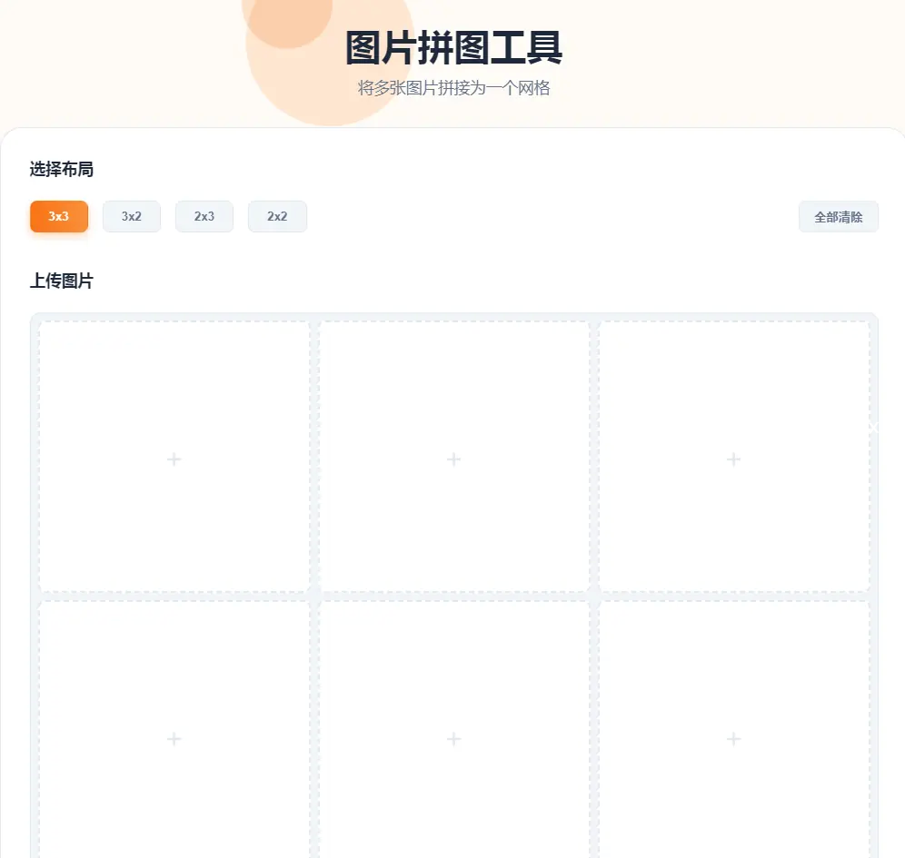 免费的在线图片拼图工具,可将多张图片轻松合成一张9宫格、6宫格或任意网格的拼图。所有操作均在浏览器本地完成,一键生成并下载高清大图。