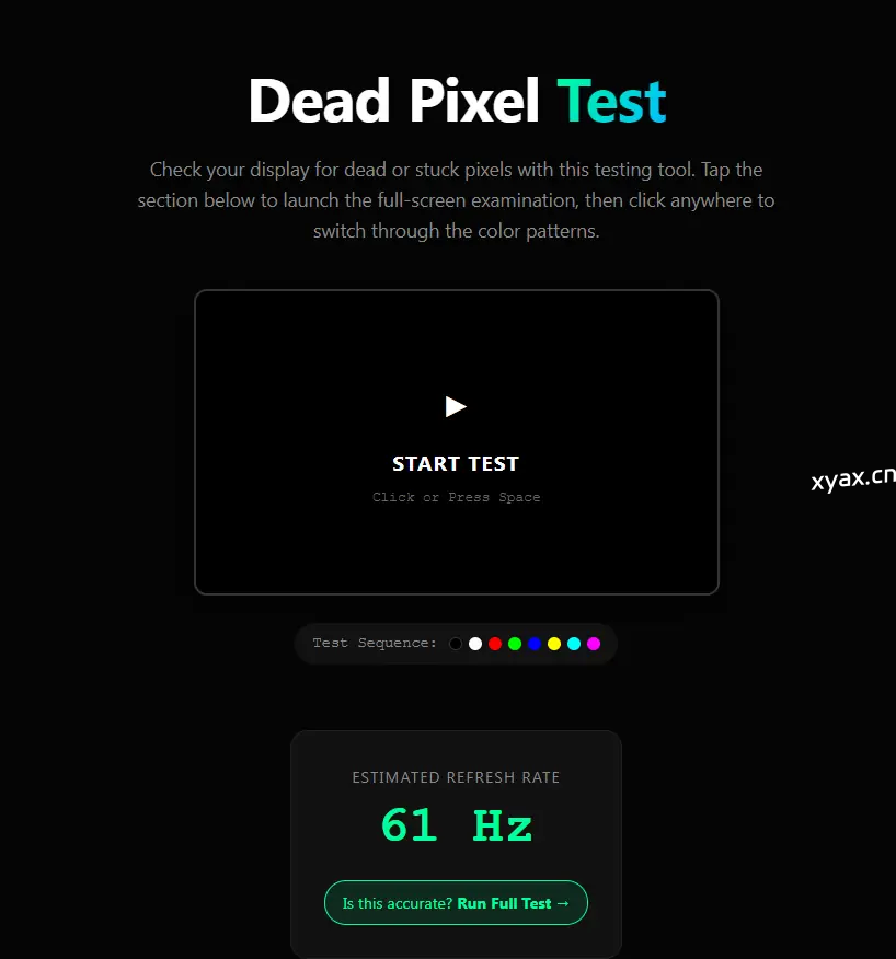 使用此测试工具检查显示器是否有死像素或卡住像素。点击下面的部分以启动全屏检查,然后单击任意位置以切换颜色模式。