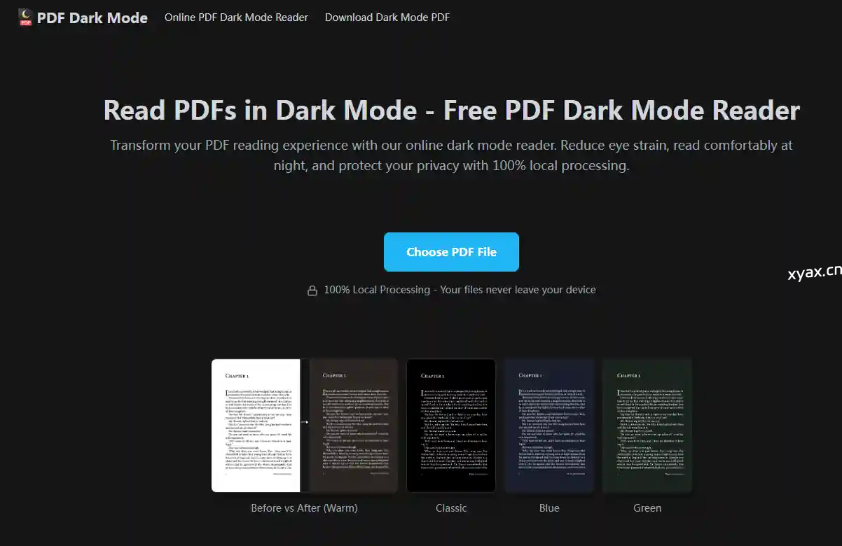 您的PDF文件完全在浏览器中使用本地处理技术进行处理。文件永远不会离开您的设备,永远不会上传到任何服务器,并且是完全私密的。这确保了敏感文档的最大安全性,同时提供即时的PDF暗模式查看,无需担心隐私问题。