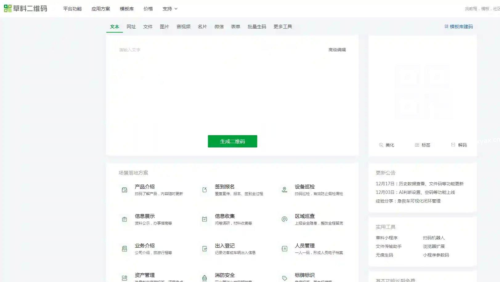 一站式二维码生成工具,免费可用。提供编码解码、数据统计、富文本和多媒体展示、表单制作、美化标签、批量管理等功能,并可作为无代码平台,搭建二维码信息系统。