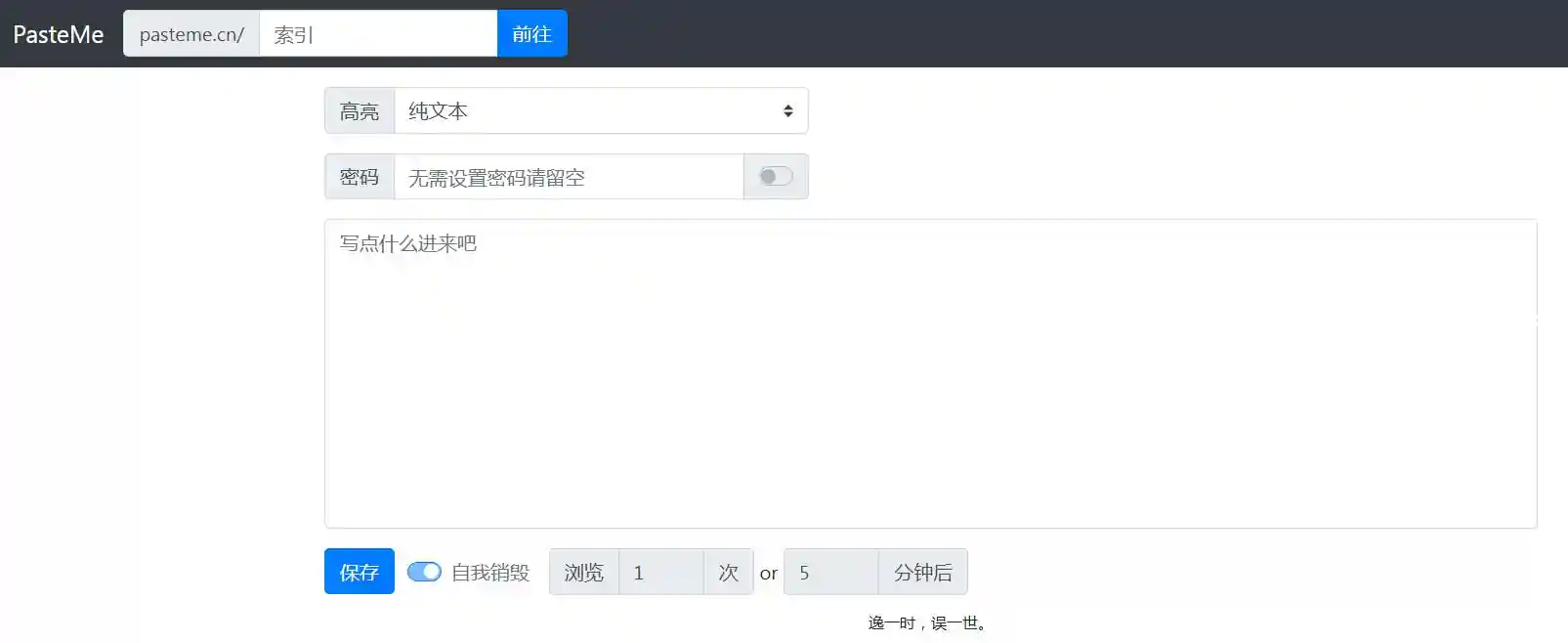 把一段纯文本或者代码片段通过 URL 分享出去,支持密码和阅后即焚。
