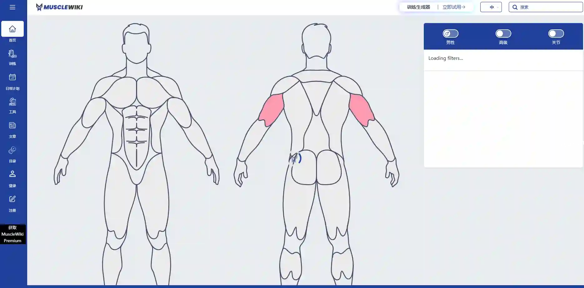 MuscleWiki是一个智能健身网站,他能为你量身打造专业训练方案。首页采用直观的人体肌肉模型,轻触目标肌群即可获取专属训练课程和示范视频。网站支持性别切换功能(右上角),用户可根据实际条件筛选训练内容,居家锻炼者也能找到合适的徒手训练项目。