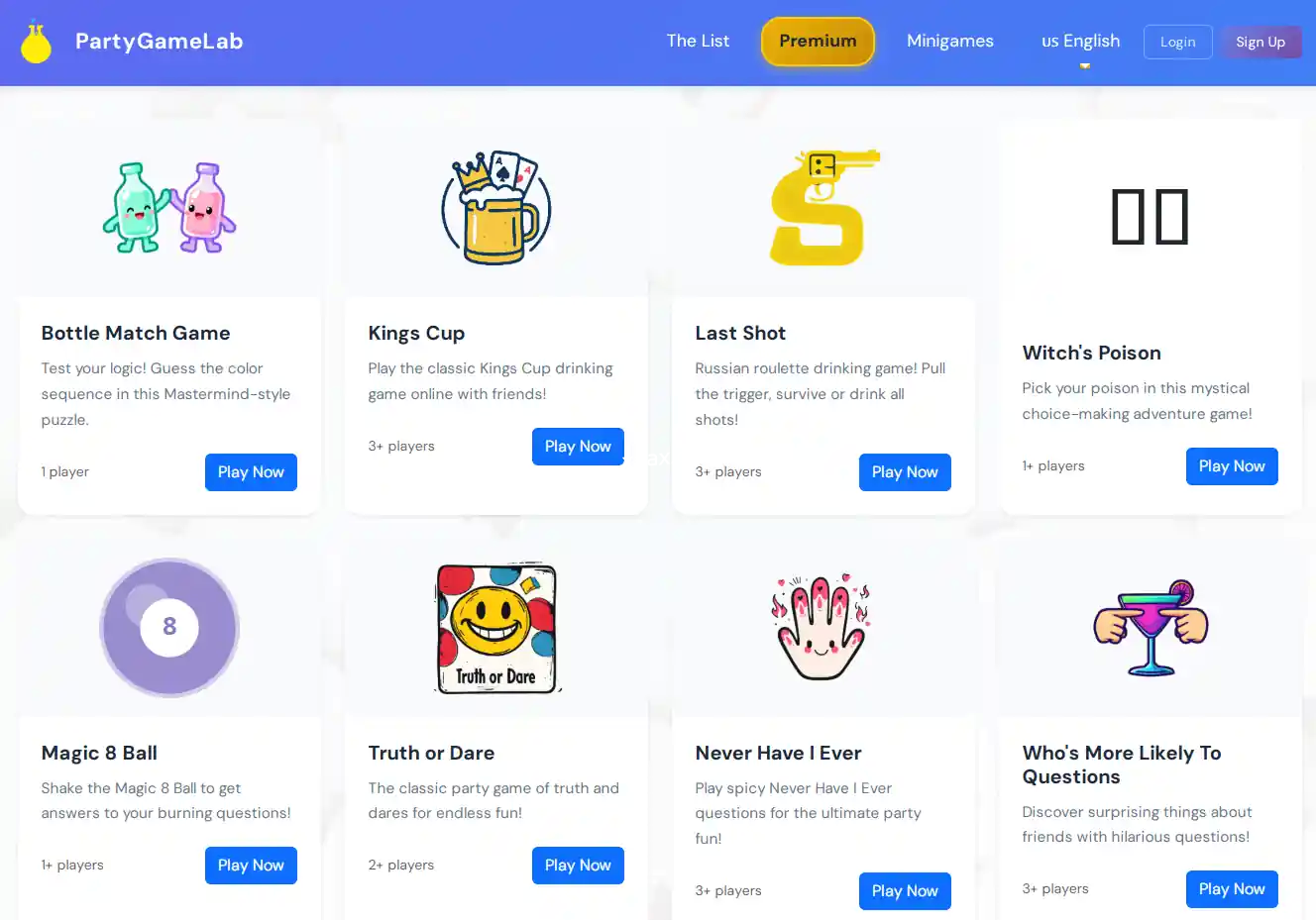 我们所有的多人聚会小游戏都是完全免费的,无需下载或安装。只需打开浏览器,选择游戏,立即开始游戏。非常适合即兴聚会或计划活动。