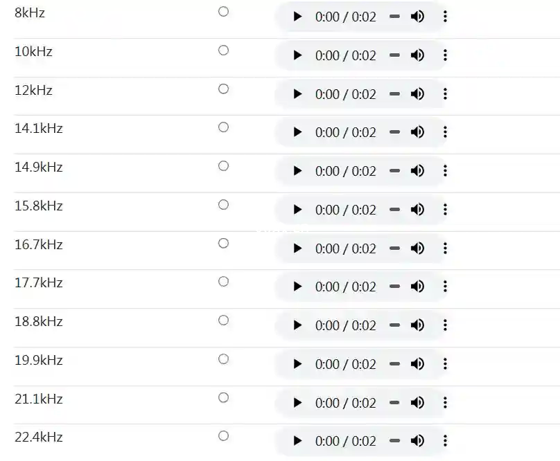 来测试一下你的耳朵能听到超声波铃声的频率范围有多广。几乎每个人都能听到最低音(8kHz)。很多人应该能听到大约14.1kHz的声音,而从大约17kHz开始,我们就进入了只有20岁以下人群才能听到的频率范围!