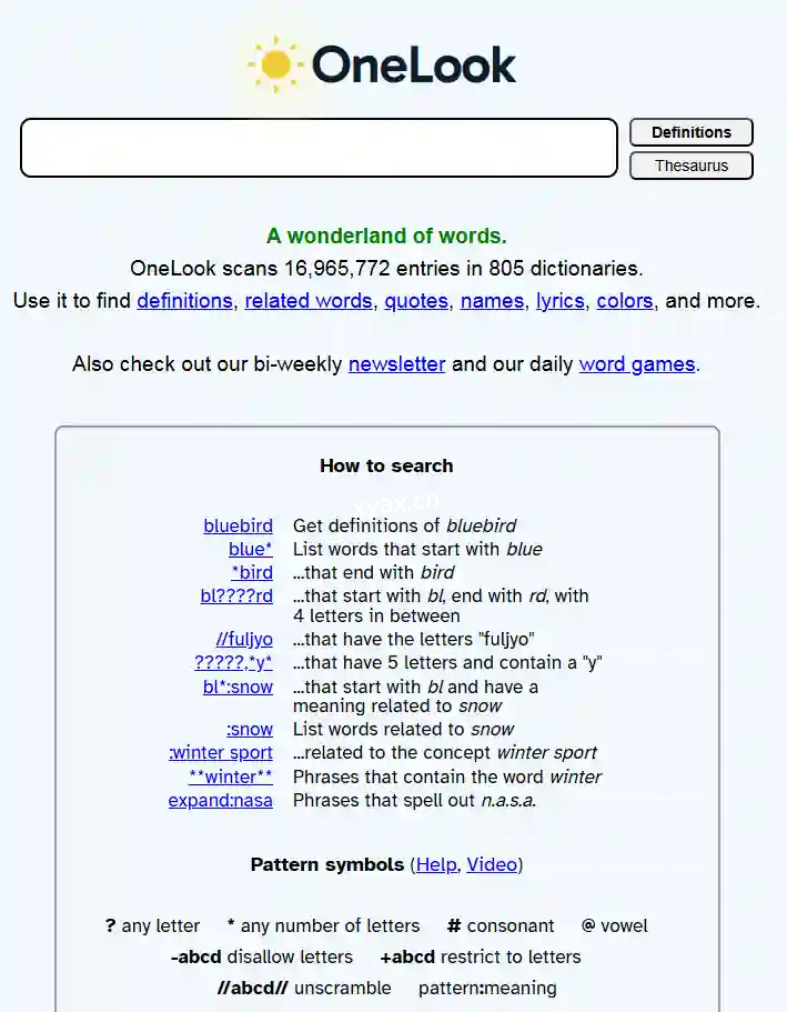 你可以将本网站看作是英语单词与短语搜索引擎:若你想查询某个单词的释义,我们会直接为你跳转至收录该词释义的网络词典。若你不确定该选用哪个词汇,我们也能帮你找到合适的表达。再生僻的单词也不在话下 ——OneLook 搜索引擎已为1000 多部在线词典中的超过 1900 万个单词建立了索引。