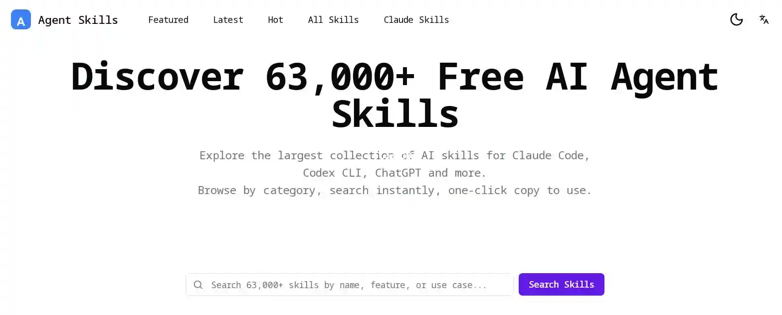 探索Claude Code、Codex CLI、ChatGPT和Google Antigravity的63.000多种免费AI代理技能。由SKILL.md开放标准格式提供支持——按类别浏览,即时搜索,并复制和使用于编码、写作、分析和自动化。