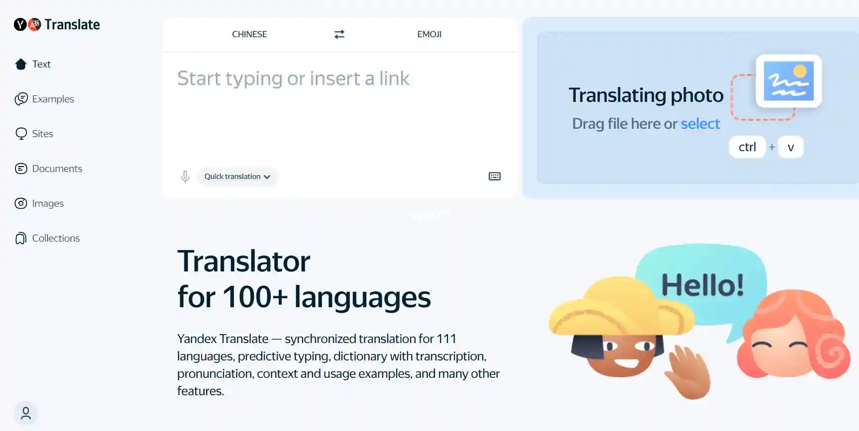 Yandex Translate是一款免费的在线翻译工具,支持超过90种语言的文本、文档和图像翻译。除了翻译功能,Yandex Translate还提供了一本全面的词典,其中包含单词和短语的含义、同义词以及使用示例。