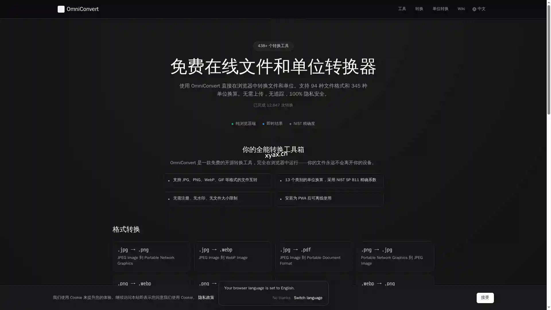OmniConvert 是一款免费的在线文件格式转换和单位转换工具。无论您需要转换图片(JPG、PNG、WebP、HEIC、AVIF)、音频(MP3、WAV、FLAC)、视频(MP4、WebM)、文档(PDF、Markdown)还是数据文件(CSV、Excel、JSON),加上 13 个类别 345 种 NIST 精度的单位换算 — OmniConvert 都能在浏览器中直接完成。无需上传,无追踪,100% 隐私安全。