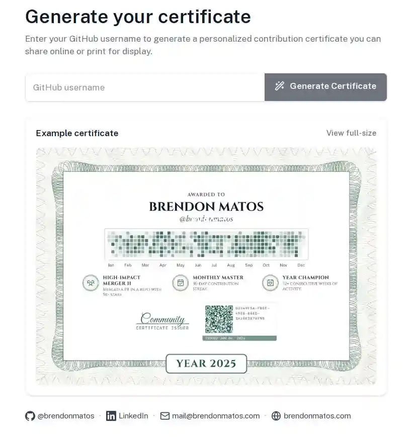 GitHub贡献证书生成,输入ID一键获取开发者的专属荣誉。自动拉取主页数据,智能生成精美版式,支持高清大图保存分享。界面清爽无广告,无需登录,让代码提交记录瞬间充满仪式感。