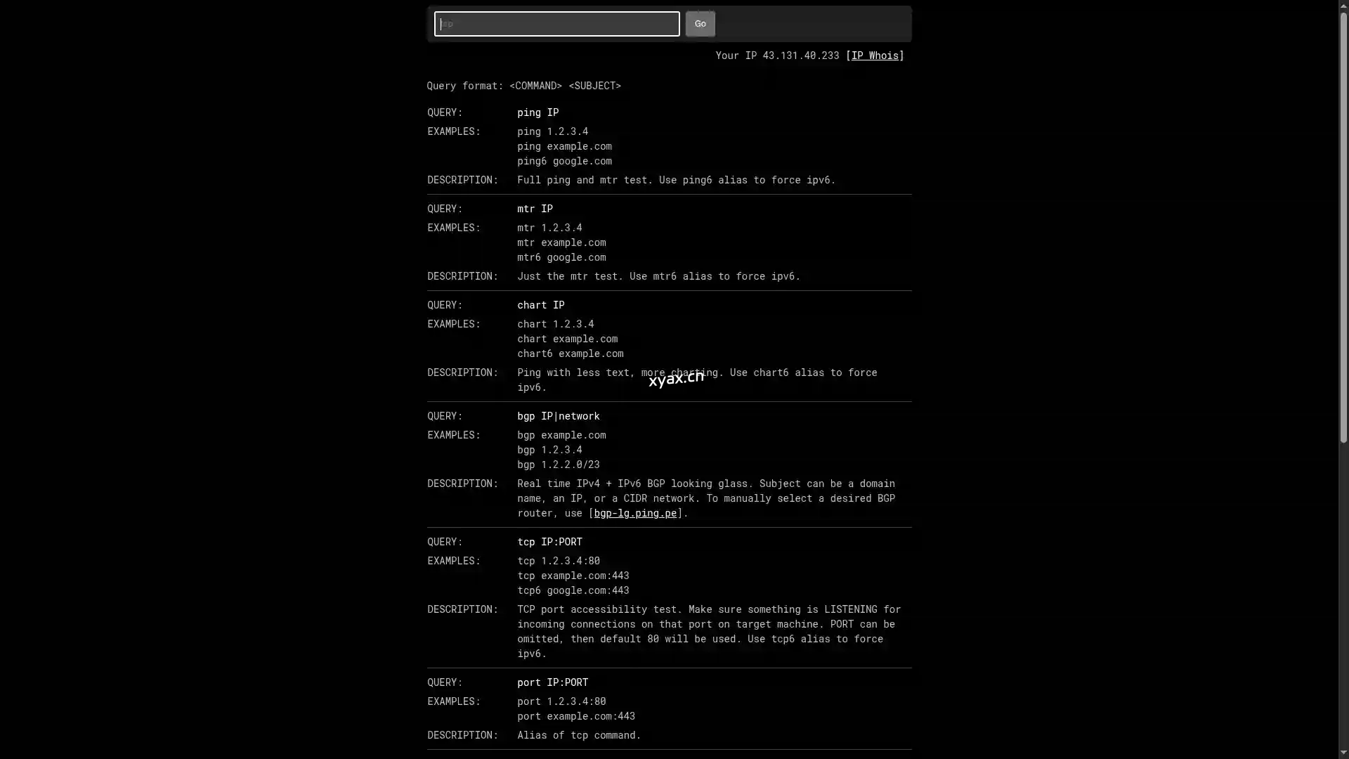 一个用于网络连接的测试和诊断的工具。可以通过输入特定的命令和目标IP地址或域名,执行ping、mtr、TCP端口检查、BGP查询和DNS记录查找等操作。