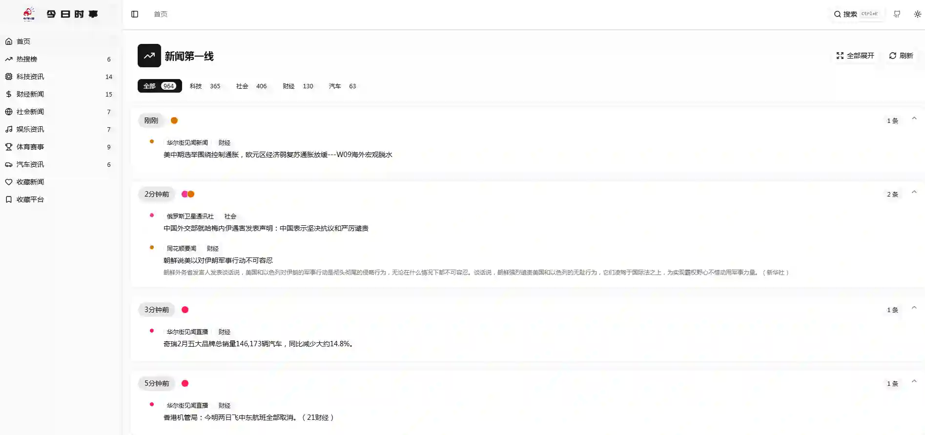 一个实时聚合各大平台最新资讯的新闻平台,按时间顺序展示来自多个来源的新闻,包括头条、百度、知乎、V2EX、微博、贴吧、豆瓣等,涵盖科技、财经、社会、娱乐、体育、汽车等多个领域。
