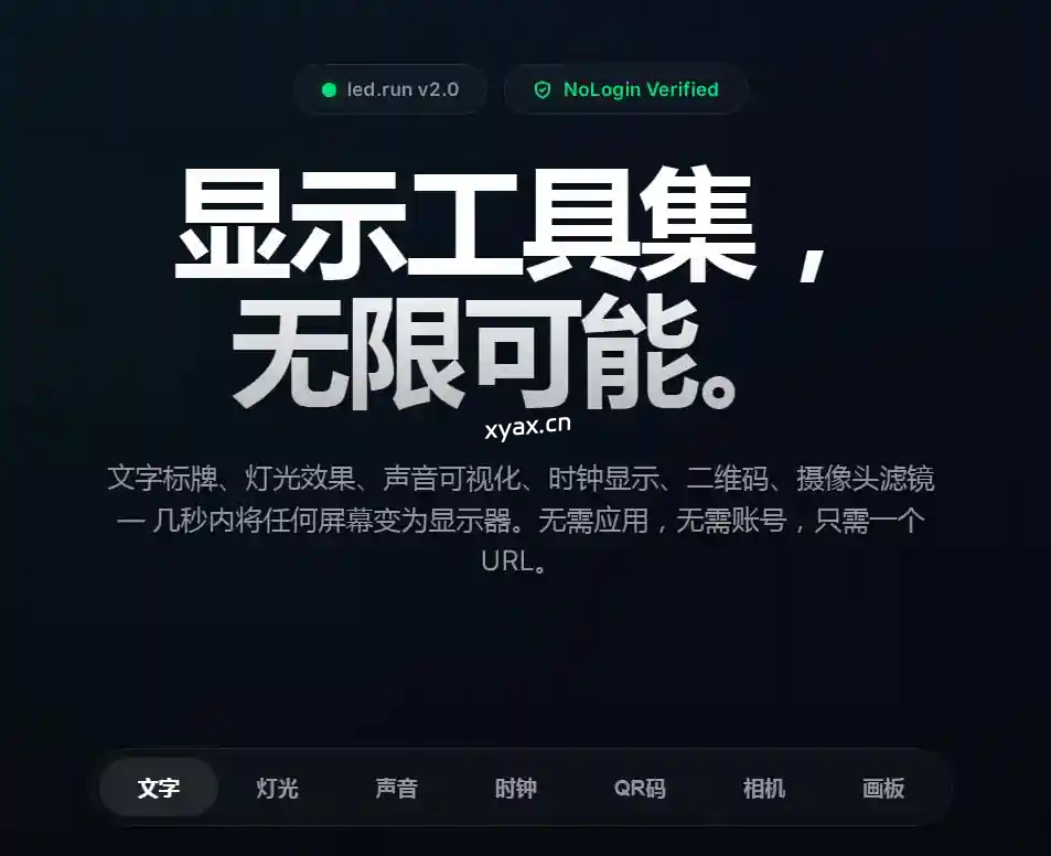 文字标牌、灯光效果、声音可视化、时钟显示、二维码、摄像头滤镜 — 几秒内将任何屏幕变为显示器。无需应用,无需账号,只需一个 URL。