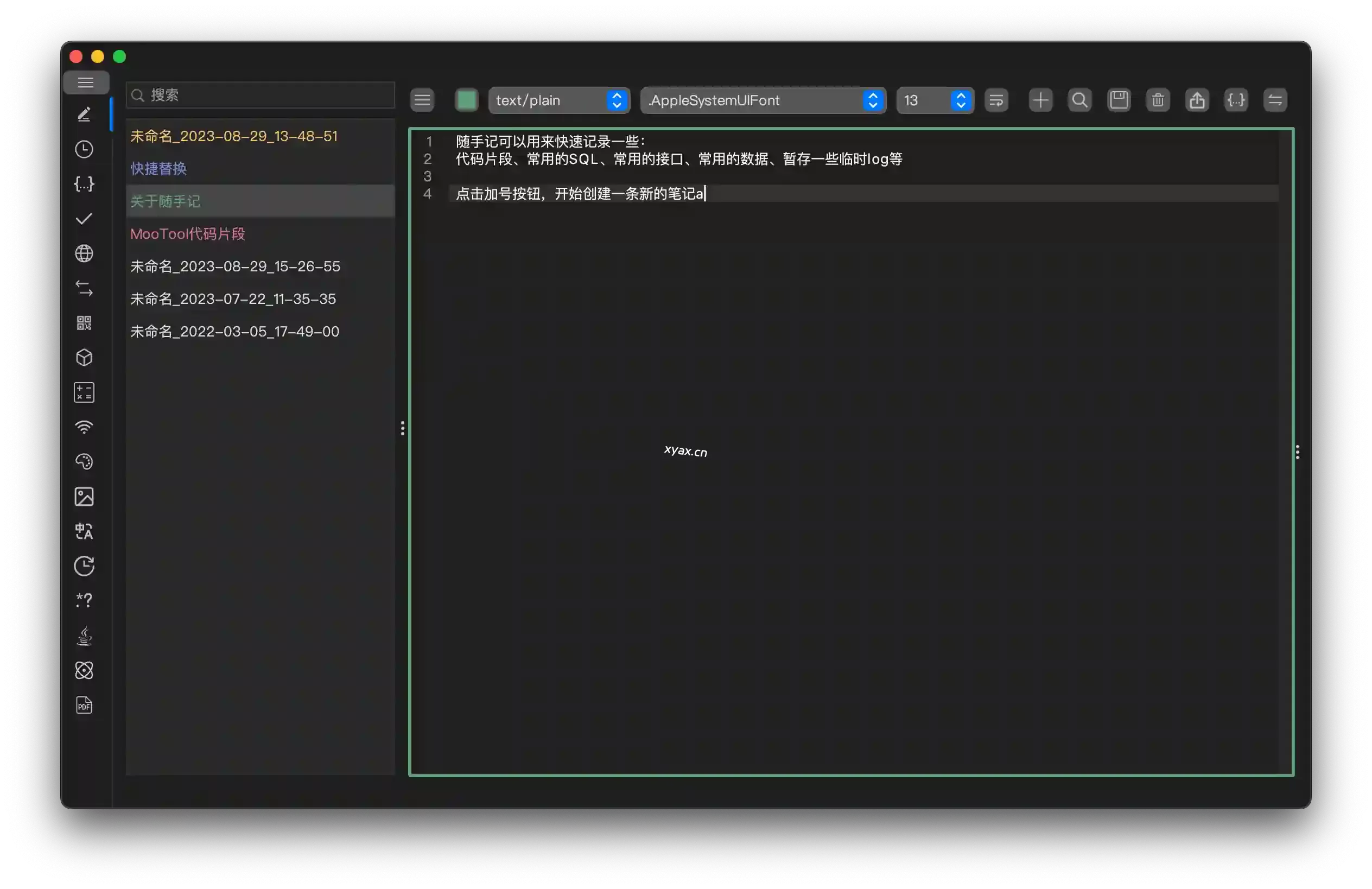 记录代码片段、常用的SQL、常用的接口、常用的数据、暂存一些临时log等。