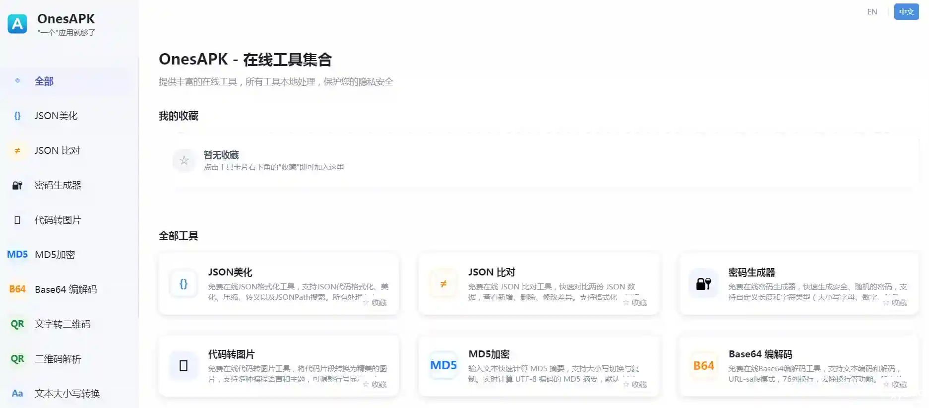 OnesAPK提供丰富的在线工具,所有工具本地处理,保护您的隐私安全。 在线网址:https://onesapk.com/zh 声明:本站内容均收集于互联网,如不慎侵犯到您的版权利益,请附带相关证明文件来信本站将立即予以下架删除。