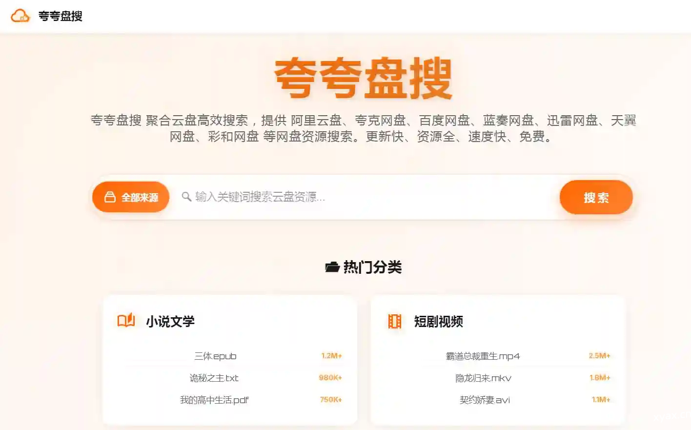 夸夸盘搜聚合云盘高效搜索,提供阿里云盘、夸克网盘、百度网盘、蓝奏网盘、迅雷网盘、天翼网盘、彩和网盘 等网盘资源搜索。更新快、资源全、速度快、免费。